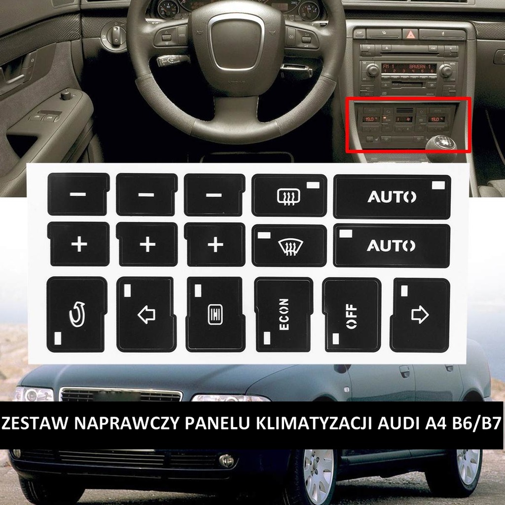 Informacje o zestaw naprawczy panel klimatronik audi a4 b6 b7 6657253853 w archiwum allegro. Audi a4 b6 b7 exeo zestaw naprawczy panelu klimatyzacji naklejki klim. Aby przywrocic wyglad swojego panelu mozna kupic nowy panel za kilkaset zlotych lub zastosowac zestaw naprawczy w postaci naklejek ktore mozna kupic za kilkanascie zlotych. Naklejki naprawcze przycisku klimatyzacji ac.
